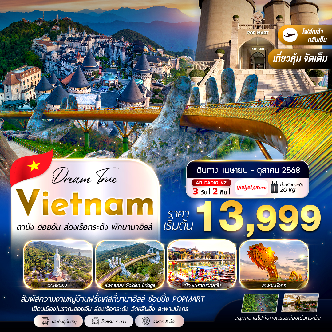 ทัวร์เวียดนาม เที่ยวสบาย บินบ่าย - กลับเย็น บาน่าฮิลล์ฟีลขึ้นสวรรค์ มหัศจรรย์เมืองมรดกโลกฮอยอัน 4วัน 3คืน (VZ)